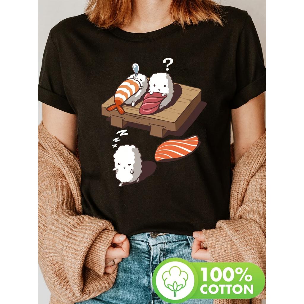 Sleep Walking Sushi Print T-shirt, Short Sleeve Crew Neck Casual Top for Summer & Spring, Women's Clothing