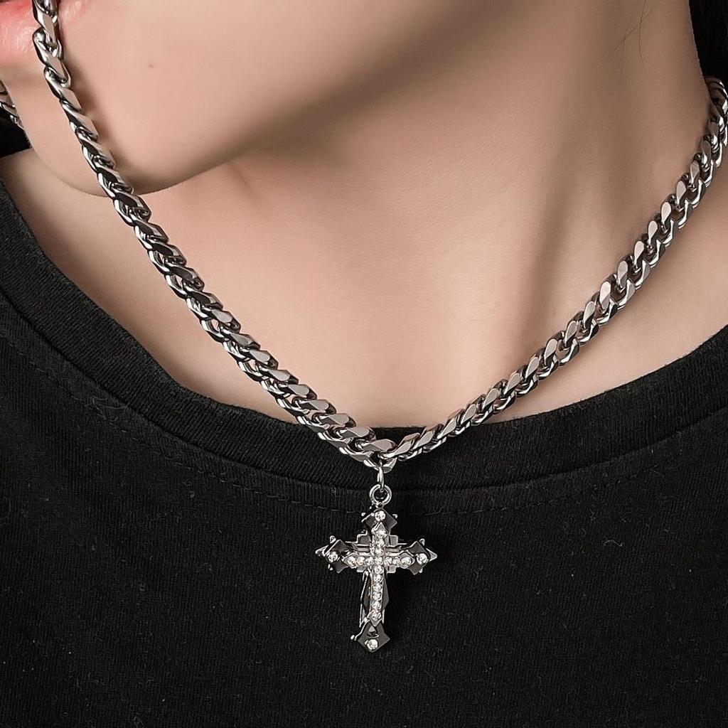 Necklace Cuban Chain Cross Pendant Male Tide Hip Hop Titanium Steel Non-Fading High Street Thick Versatile Necklace