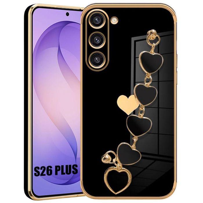 Coque pour Samsung Galaxy S26 Plus, Silicone Souple Slim Noir Motif Cœur avec Bracelet