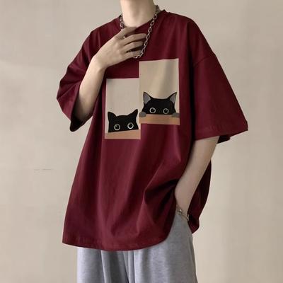 Tricou de bumbac cu mânecă scurtă pentru bărbați, larg, cu imprimeu, cu gât rotund
