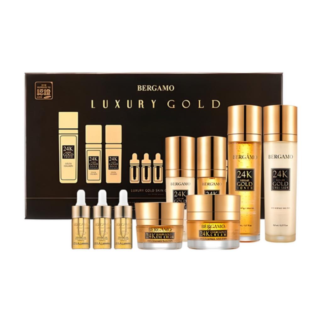 A premium anti-aging skincare set enriched with Gold extract to help improve skin elasticity, radiance, and overall vitality. The Luxury Gold 9 Pieces Set provides a complete skincare routine—from toner to cream—designed to nourish, firm, and revitalize tired-looking skin. Ideal as a full routine upgrade or a luxurious gift set.