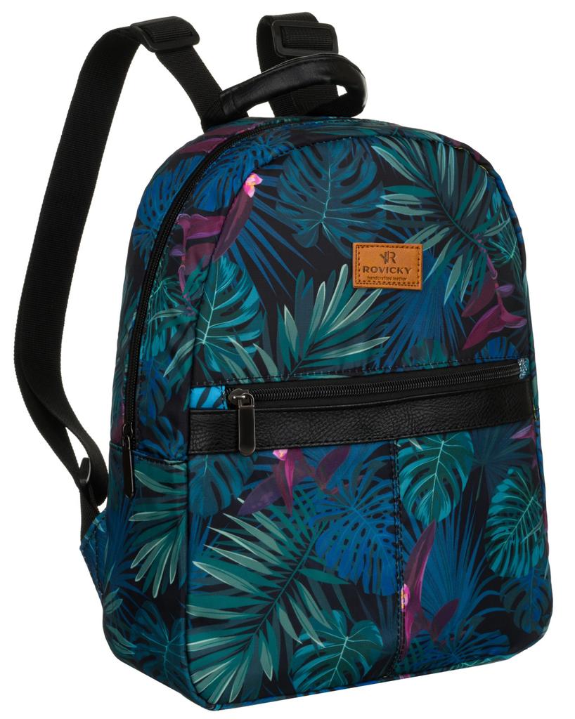 Backpack for college, school, work, women's, youth, compact backpack Tired of large and bulky bags that strain your hands?Choose a comfortable backpack! Put it on your back and walk confidently!Fashionable women's backpack with a plant pattern ROVICKY® #⃣ Polish brand | A well-known and respected manufacturer whose products are highly appreciated by women all over the world!#⃣ Quality and precision of workmanship | High-quality materials. High-quality materials ensure long-lasting use.#⃣ Plants, colorful pattern | Backpack decorated with a charming, colorful leaf pattern#⃣ Small backpack with additional pockets | The inside is lined with fabric. It has two additional interior pockets and one exterior pocket.#⃣ Comfort and convenience of carrying | Suspended on long, adjustable straps and a hand grip, reliable in public transport. Parameters brand: ROVICKY® height: 30 cm width: 25 cm depth: 9 cm Handle height: 8 cm Maximum strap length: 85 cm Compartments: 1 Pockets: 3 Fastening: zipper Weight: 220 g Fittings color: silver Urban-Style BackpackA small women's backpack made of very durable, high-quality materials. This model is filled with urban style with a touch of classic elegance.The perfect alternative to bags. It doesn't matter whether you want to wear it to work, school, university, or a meeting with friends. Every woman should have a place for this universal accessory in her wardrobe! An accessory that frees your hands and is simply the most convenient to use :) Extensive interiorA classic women's backpack will accommodate all your personal belongings and also provide great carrying comfort.The presented model is equipped with 1 compartment and 2 additional pockets. One of the pockets is closed with a zipper, the other is open. Despite its small size, you can easily fit your wallet, phone, keys, or a few basic cosmetics in it. External pocketAn undoubted advantage of this model is the handy pocket on the outside. A large pocket is located on the front - fastened with a zipper.It was created for things you use often and want to have convenient access to. Details that are importantIn addition to comfortable, adjustable shoulder straps, the backpack also has an irreplaceable in public transport handle made of eco-leather ROVICKY® - choose a renowned brand!ROVICKY® brand accessories are extremely popular. Each product is designed in line with current trends, referring to original and timeless style. The richness of colors and patterns, as well as high quality of workmanship, are the features that characterize the brand.Feel fashionable and comfortable in every situation, complement your wardrobe with fantastic accessories at very affordable prices!