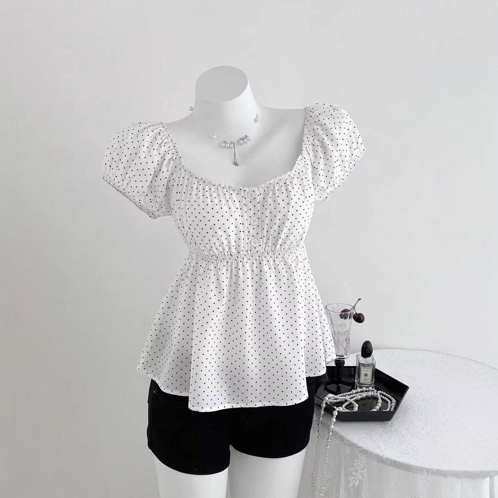 2025 European Summer Polka Dot Puff Sleeve Women's Top with French Square Neck