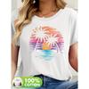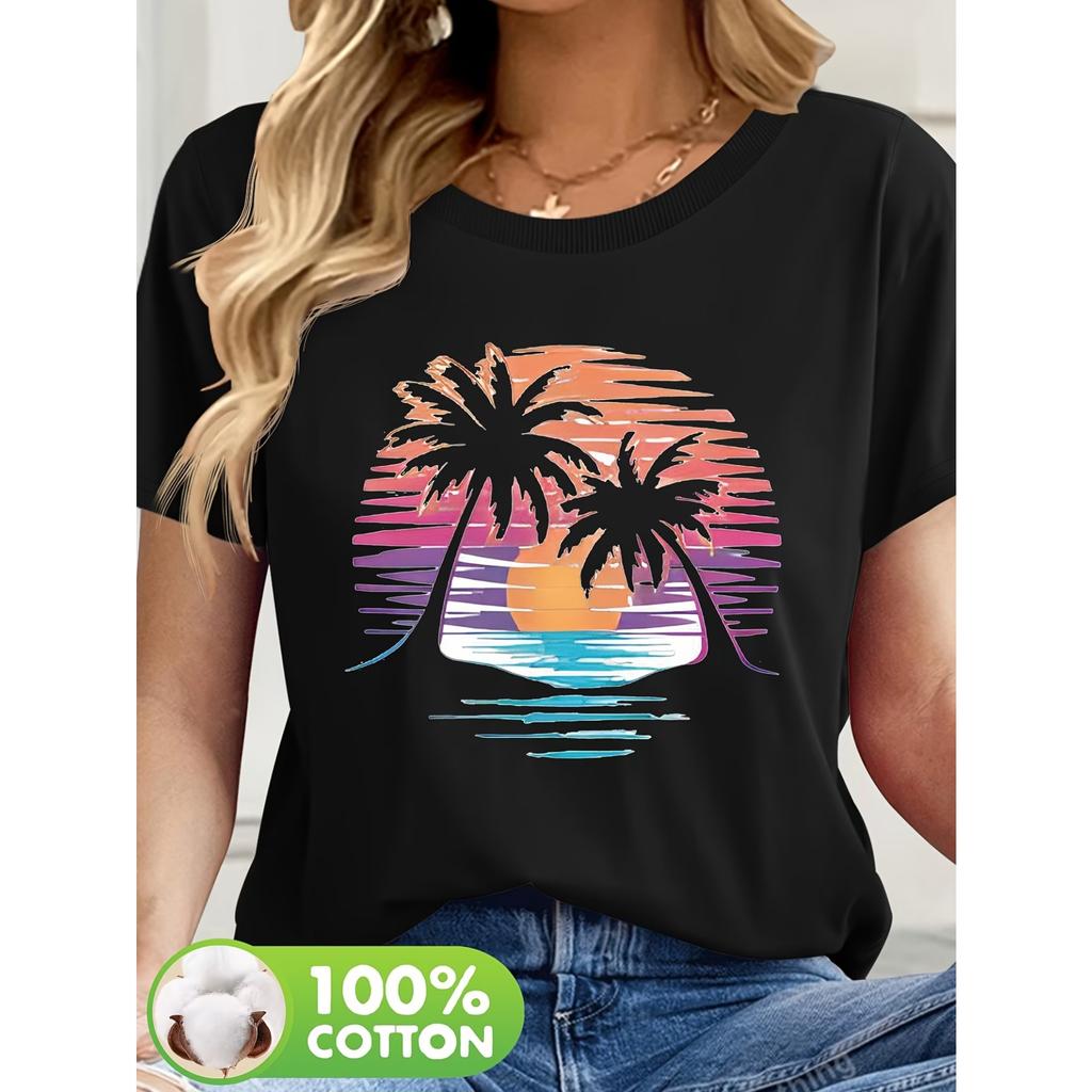 Women's Short-Sleeved T-Shirt with A Seaside Tree Pattern Print, Made of Fabric, Summer Style, T50