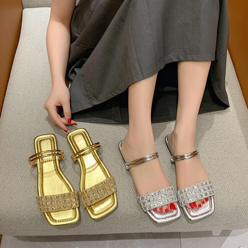 Large size flat slippers women's summer new rhinestone sequins one word belt outer wear fashion two wear sandals women