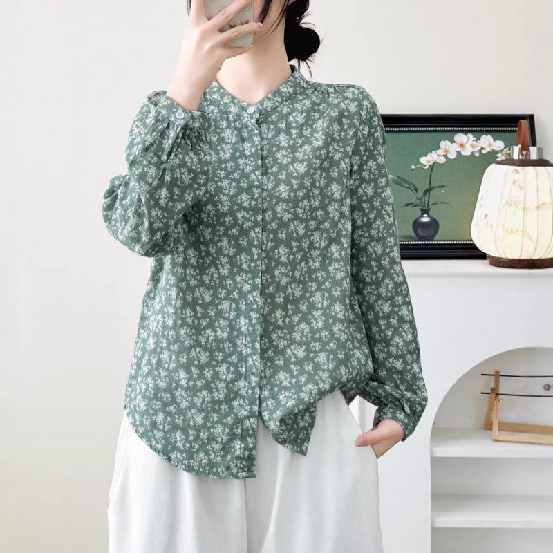 Spring 2026 Women's Printed Cotton Gauze Long Sleeve Stand Collar Cardigan Shirt