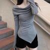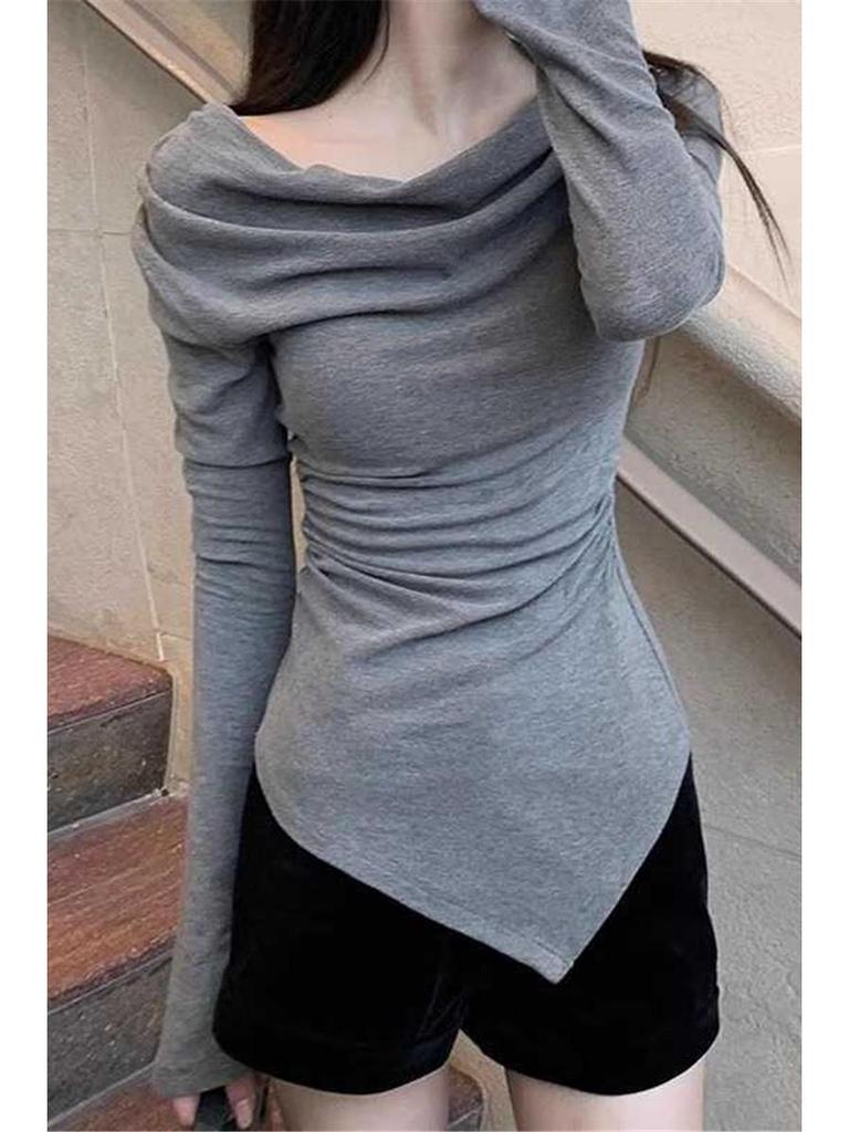 Elegant Slim-Fit Off-Shoulder Spicy T-Shirt for Women - Low-Cut, Long-Sleeved, Autumn/Winter Base Layer