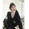 American Retro V-neck Flare Sleeve Spicy Girl T-shirt - Women's Autumn Slimming Black Long Sleeve Top.
