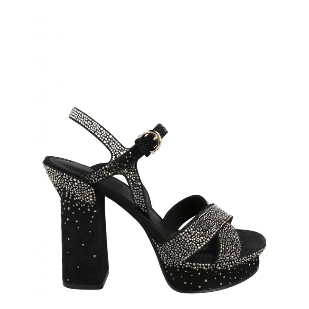 Ferragamo presents the Sonya Platform Sandals, a stunning blend of elegance and sophistication. Expertly crafted from 100% calfskin leather, these sandals feature a distinctive crisscross vamp design, a secure ankle strap closure, and a round toe. The block heel, standing at 5 inches, is complemented by a 1.5-inch platform, both adorned with shimmering allover crystal embellishments and silver-tone hardware. Ideal for evening wear or sophisticated gatherings, these sandals embody a luxurious appeal. - Upper Material - 100% Calfskin Leather - Heel Height - 5 inches - Platform Height - 1.5 inches - Care Instructions - Specialist clean only - Made in Italy