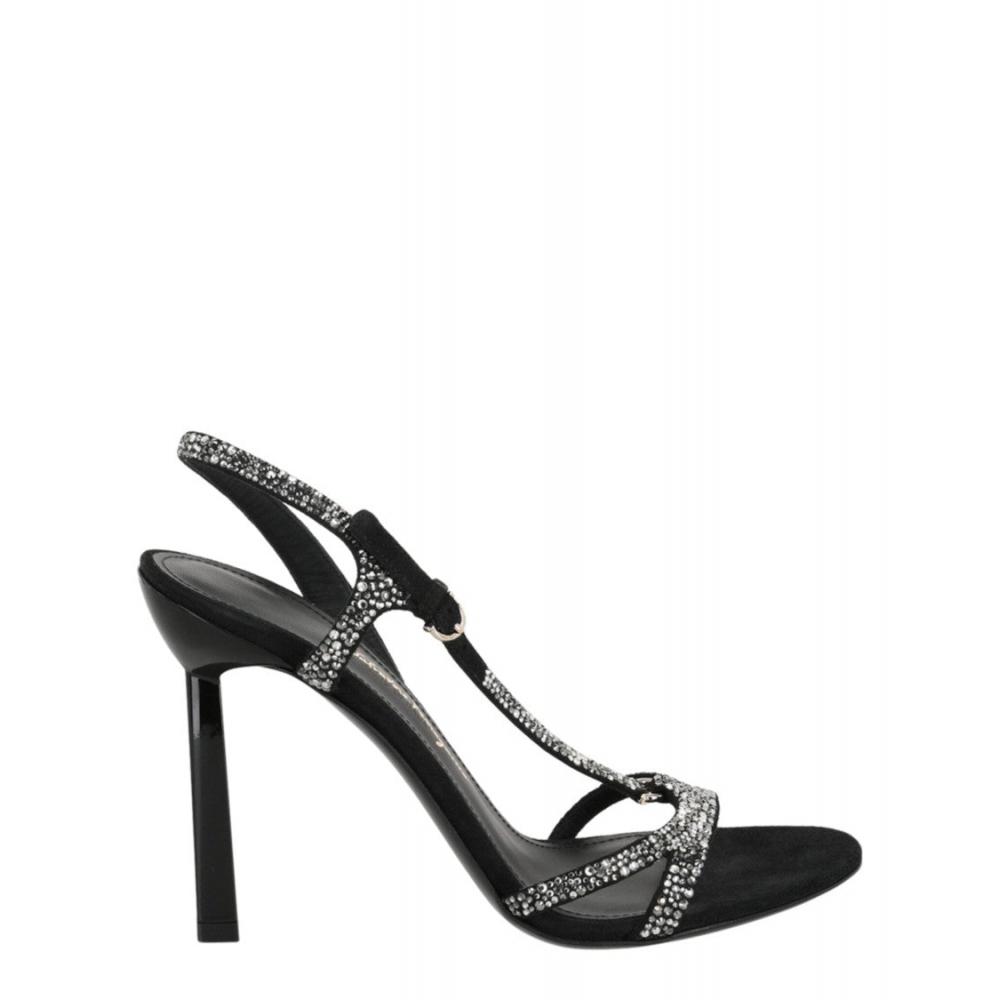 A pair of stunning stiletto heels from Ferragamo, meticulously crafted in Italy. Comfortable almond toe design with a striking gold-tone Gancini buckle. Adorned with all-over crystal embellishments for a glamorous touch.