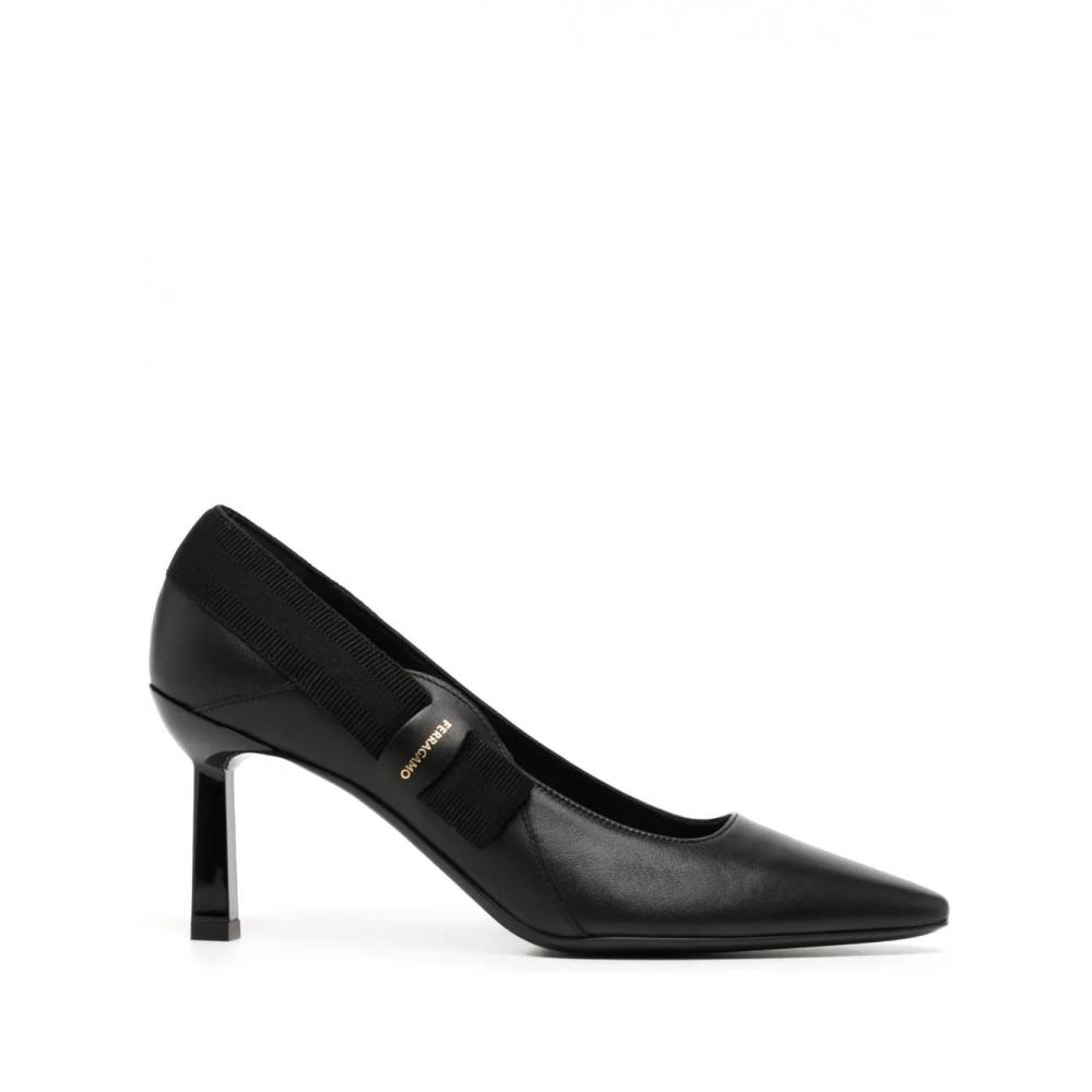 This product is the Salvatore Ferragamo "Vissia 70mm" leather pumps in black. Made from calf leather, it features a logo stamp at the front and tonal stitching. The pointed toe design enhances the overall elegance. These slip-on pumps have a branded leather insole and a mid-heel perfect for various occasions.