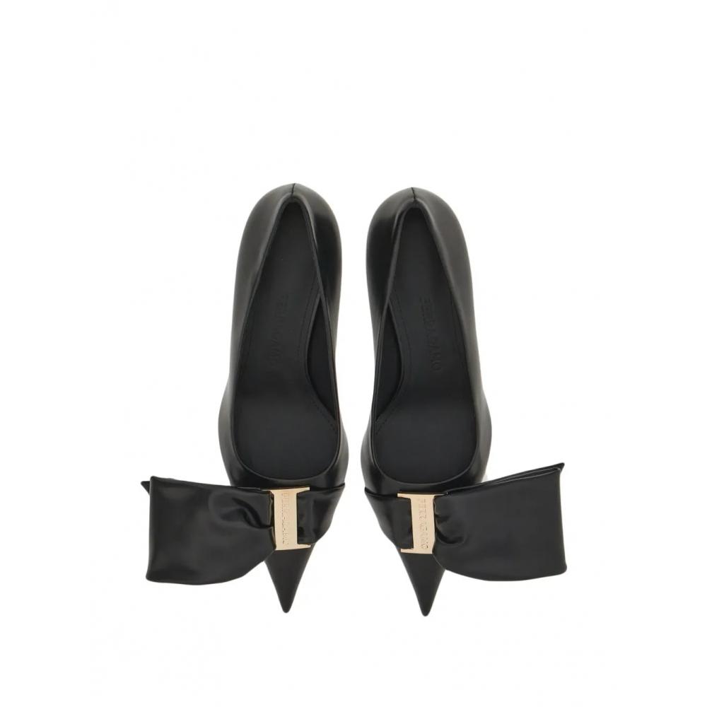 The 105Mm Oversized Bow Leather Pumps in black feature a striking oversized bow detail and elegant gold-tone hardware. The pointed toe design adds a touch of sophistication, while the slip-on style offers ease of wear. With a branded leather insole and high sculpted heel, these pumps ensure a comfortable stride.