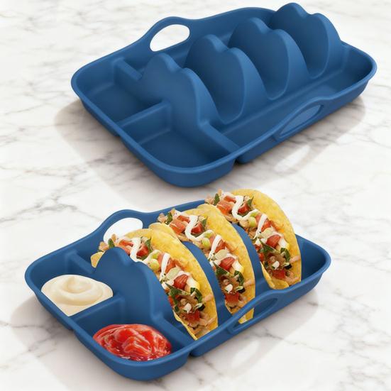 This taco tray is crafted from heat-resistant silicone, ensuring safe direct food contact and durability for both home and restaurant use. Measuring 25.2cm x 20cm x 5.8cm (9.92in x 7.87in x 2.28in), it features a divided slot design that securely holds multiple tortillas or quesadillas, preventing odor transfer, slipping, and deformation to keep your food neat and fresh.