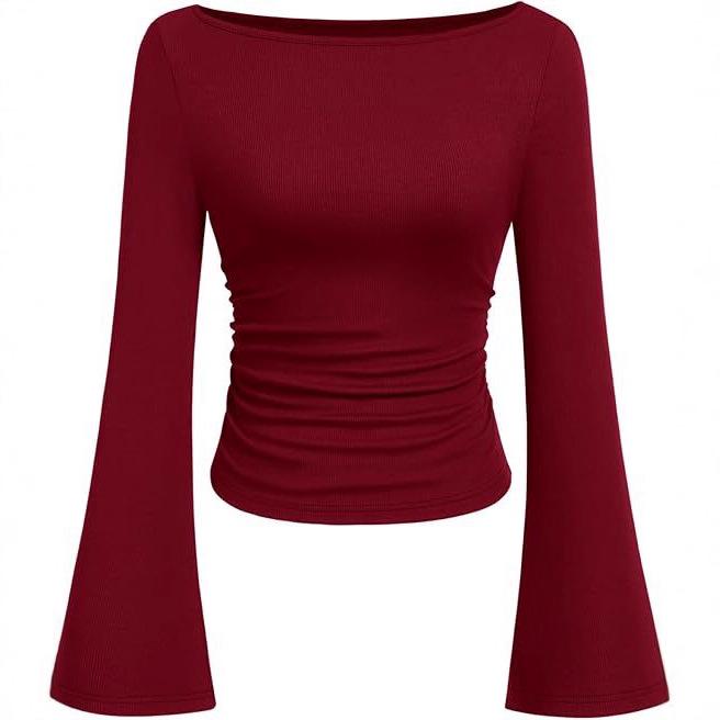 Elevate your wardrobe with this elegant Autumn top designed for the modern woman. Crafted from a high-quality tencel blended fabric, this piece ensures both comfort and style. It features a stylish boat neck and flattering bell sleeves, with a ruched design that adds a touch of sophistication. The solid color makes it versatile, perfect for various occasions, whether it's a day at the office or an evening out. The slim fit silhouette accentuates your figure, making it a must-have addition to your seasonal collection.