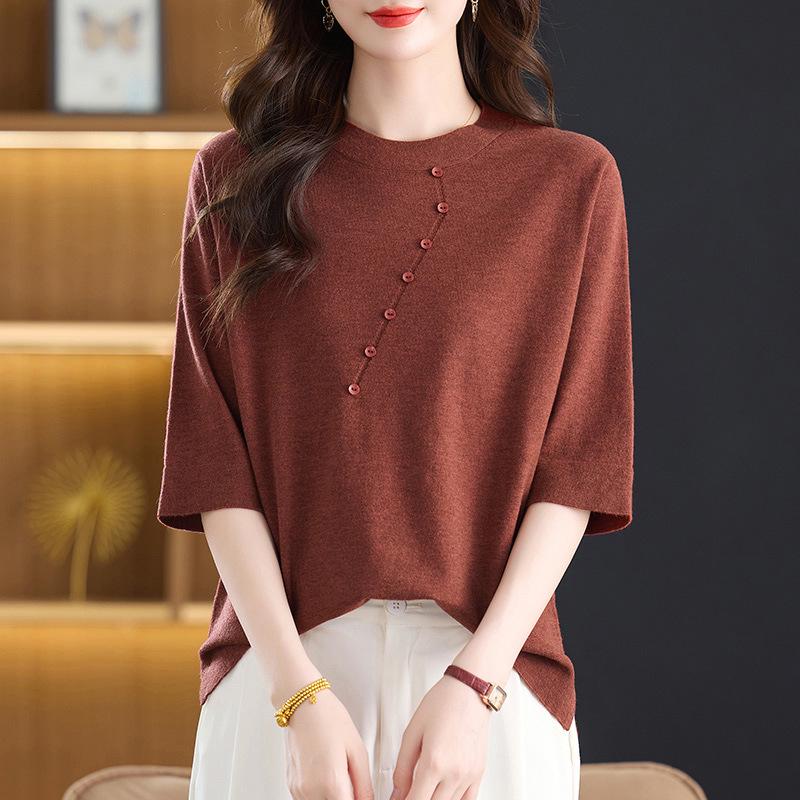 Stylish Plus Size Round Neck Knit Top for Middle-Aged Women - Mid-Sleeve Sweater