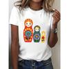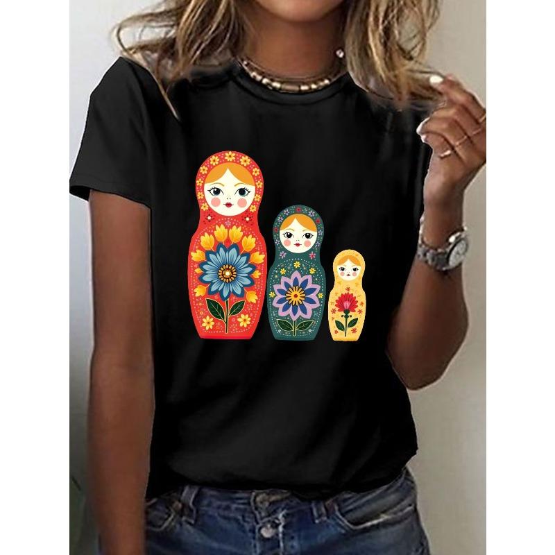 Women's Green Russian Nesting Dolls & Flowers Print T-Shirt Casual Crew Neck Short Sleeve Summer Top