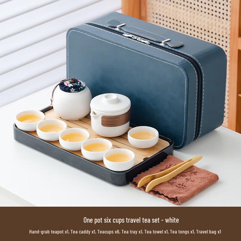 Portable Rough Pottery Travel Tea Set with Blue Leather Carry Bag