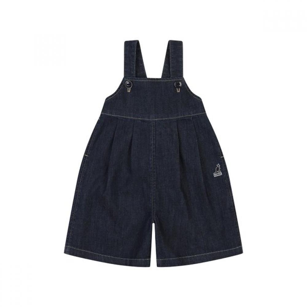[Baby] Denim Wide Fit Overall SB 0D17 Navy is a wide-fit product made from stretch denim material, featuring an 8-9 length. It is distinguished by its wide tucks and stylishly designed wide slits, with an over-slit that naturally falls for an overall relaxed silhouette. The shoulder's additional buttons allow for length adjustment, and it has a padding at the waist for comfortable wear.