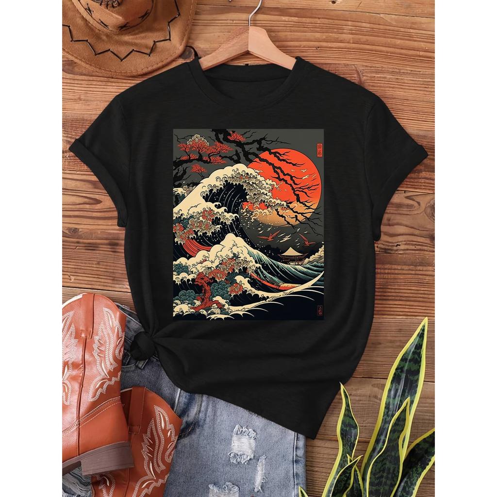 Vintage Kanagawa Japanese The Great Wave Cherry Blossom Art Print T-shirt, Short Sleeve Crew Neck Casual Top for Summer & Spring