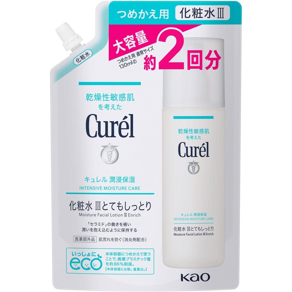 The Curel Moisturizing Toner 3 Super Moist Refill 260mL offers deep hydration to the skin, keeping it soft and moist. Formulated with eucalyptus extract and the anti-inflammatory ingredient allantoin, it reduces skin irritation while maintaining moisture. It has a smooth texture and exceptional moisturizing properties.