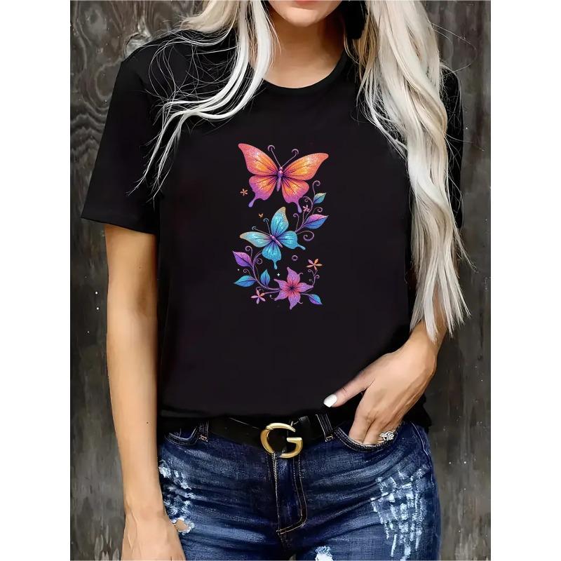 Women's Vibrant Butterfly Floral Graphic Tee Black Crew Neck Short Sleeve Casual Summer Top