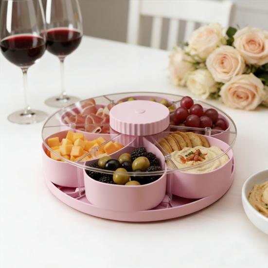 Divided Spin Serving Tray for Snack Dips Party Appetizers Rotating Snack Box Container with Lid Flower Shape Multi-Compartment Susan Organizer for