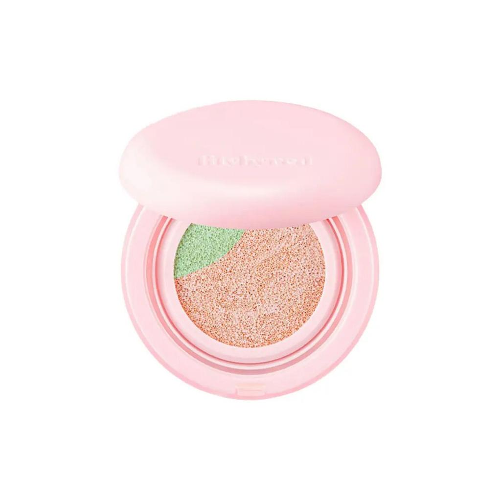Press the puff into the cushion and gently pat onto the face. Blend evenly from the center outward for natural tone correction and coverage. Reapply as needed for touch-ups and sun protection.