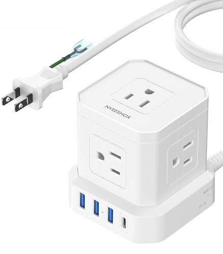 NVEESHOX Mini Cube-Shaped Power Strip with Type-C Extension Cord, 5 AC Outlets and 4 USB Ports, with Lightning Protection, for Power Strips, Multi-Pur