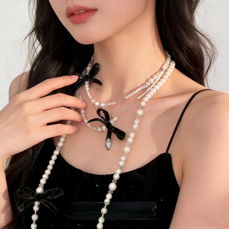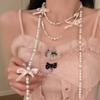 Elegant Multi Layered Pearl Ribbon Bow Layered Tassel Necklace Niche Sweet Drape Neck Chain Trendy Necklace Jewelry Accessories