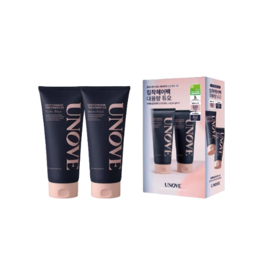 UNOVE Deep Damage Hair Treatment EX is a nourishing and restorative treatment designed to repair and strengthen damaged hair. Infused with Tender Bloom and Warm Petal extracts, it helps restore moisture, reduce breakage, and enhance shine. The rich, creamy formula penetrates deeply to smooth split ends and leave hair soft, silky, and manageable. This special set includes two 320ml treatments in Tender Bloom and Warm Petal variants for complete hair care.