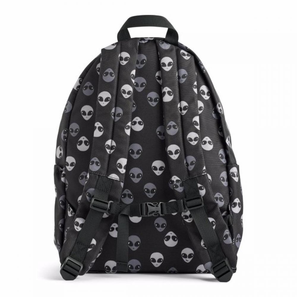 The MOLO Mio Backpack AKHF9BG004 is a children's backpack with a spacious capacity of 21L. It features a striking black color with a grey alien print, a padded pocket for safely storing a laptop or tablet, along with a front zipper pocket and side pockets for water bottles. The backpack is designed with padded backing for comfort and an adjustable chest strap for a better fit.