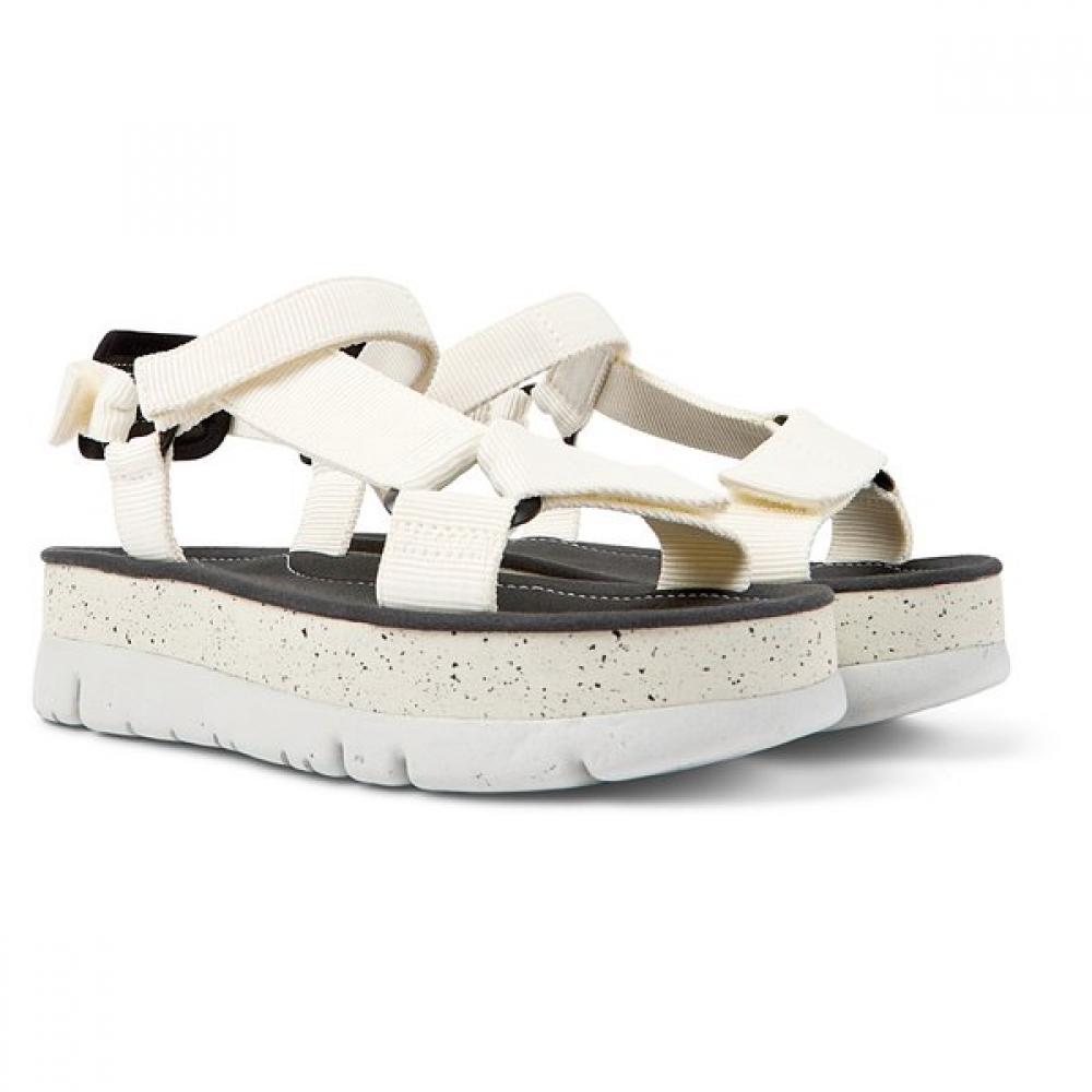 Oruga Up is a women's white sandal equipped with a closing strap made of 100% recycled PET fabric. The sandal features a 100% EVA outsole with a flex frame and has an approximate heel height of 2cm. Designed for summer, the Oruga Up sandal showcases a thick yet distinctive outsole for a unique look and elevated height.