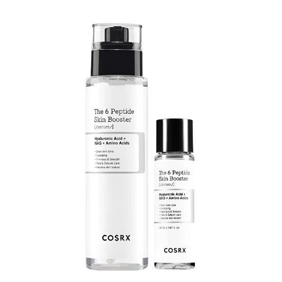 COSRX The 6 Peptide Skin Booster Serum is a lightweight yet powerful booster serum formulated with six types of peptides to improve skin elasticity, hydration, and overall skin condition. Infused with Hyaluronic Acid, N-Acetyl Glucosamine (NAG), and amino acids, it helps deeply hydrate and smooth skin texture while supporting a healthy skin barrier. The watery essence texture absorbs quickly, preparing the skin to better absorb the next skincare steps. This special set includes a 150ml full-size serum plus a 30ml mini, perfect for extended use or travel.