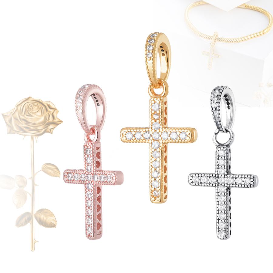 Sparkling CZ Cross Pendant Charm for Bracelet Necklace, 925 Silver Plated, Religious DIY Jewelry Gift for Women Men