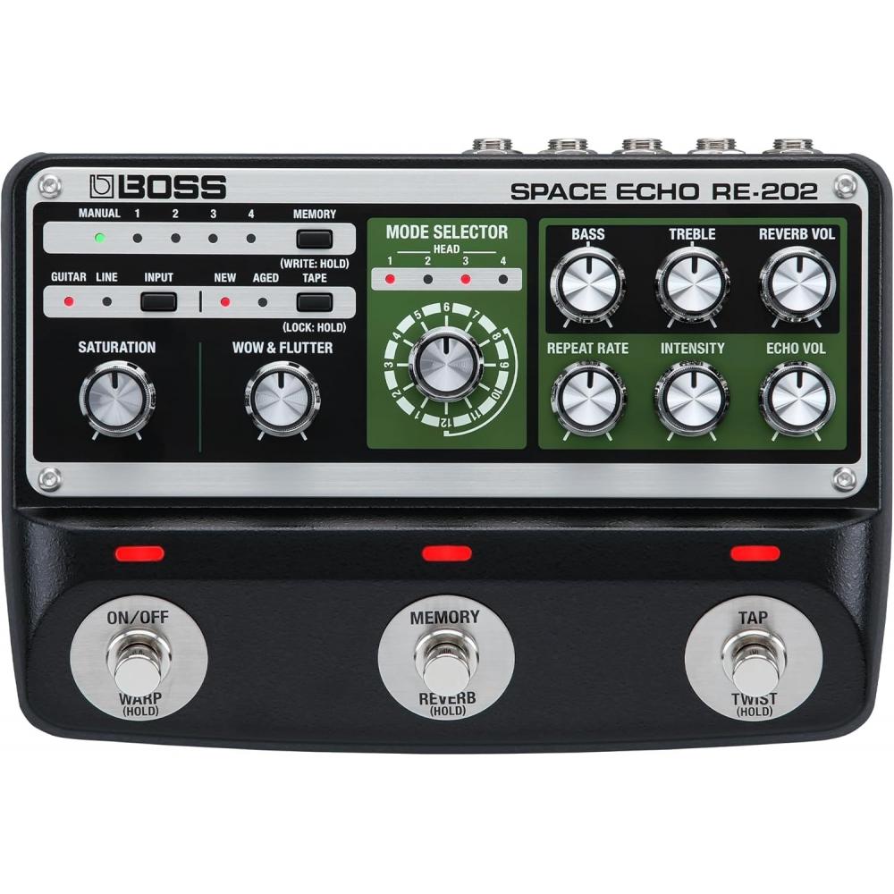 The BOSS RE-202 Space Echo Reverb Guitar Effect Pedal modernly recreates the legendary Space Echo sound, providing various features that maximize the charm of your music with a rhythmic and warm tonal quality. It offers 12 sound variations through the combination of four playback heads and includes five reverb types—SPRING, HALL, PLATE, ROOM, and AMBIENCE.