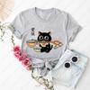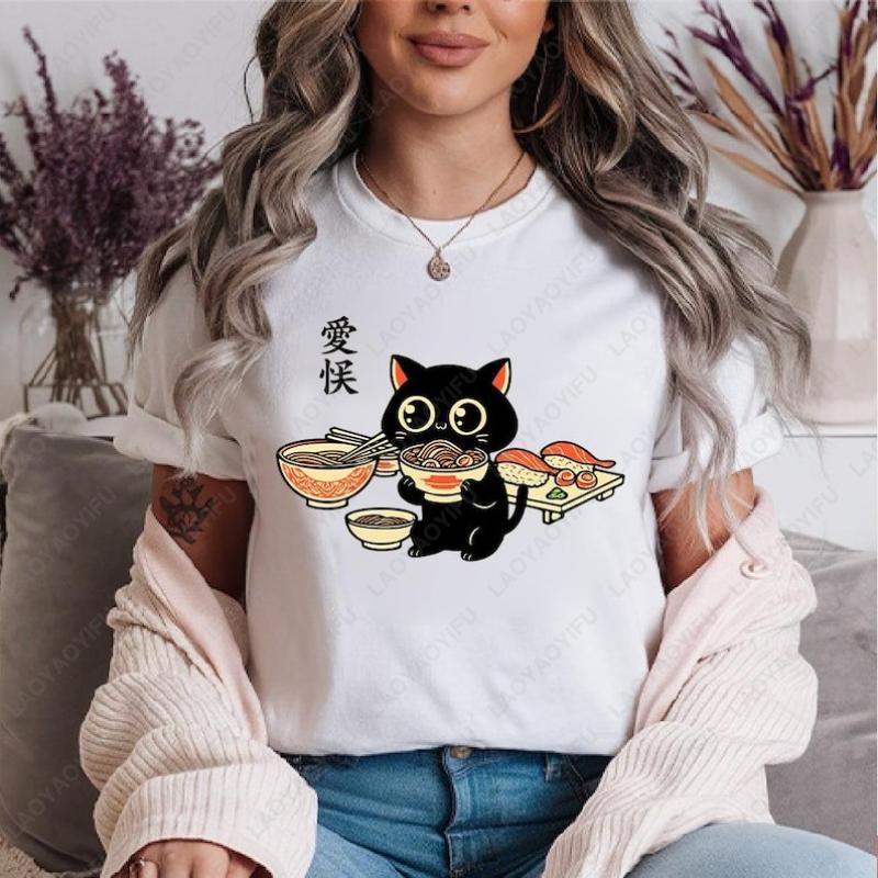 Cute Kawaii Black Cat Eating Sushi Funny Japanese Holiday Unisex Adult Cotton Tshirts Gifts Ramen Japan Food Oneck Printed Tops