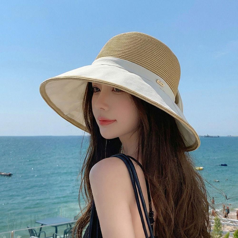 Weave Women Sun Hat Large Bow Sunscreen Bucket Hat Portable Straw Hat Travel