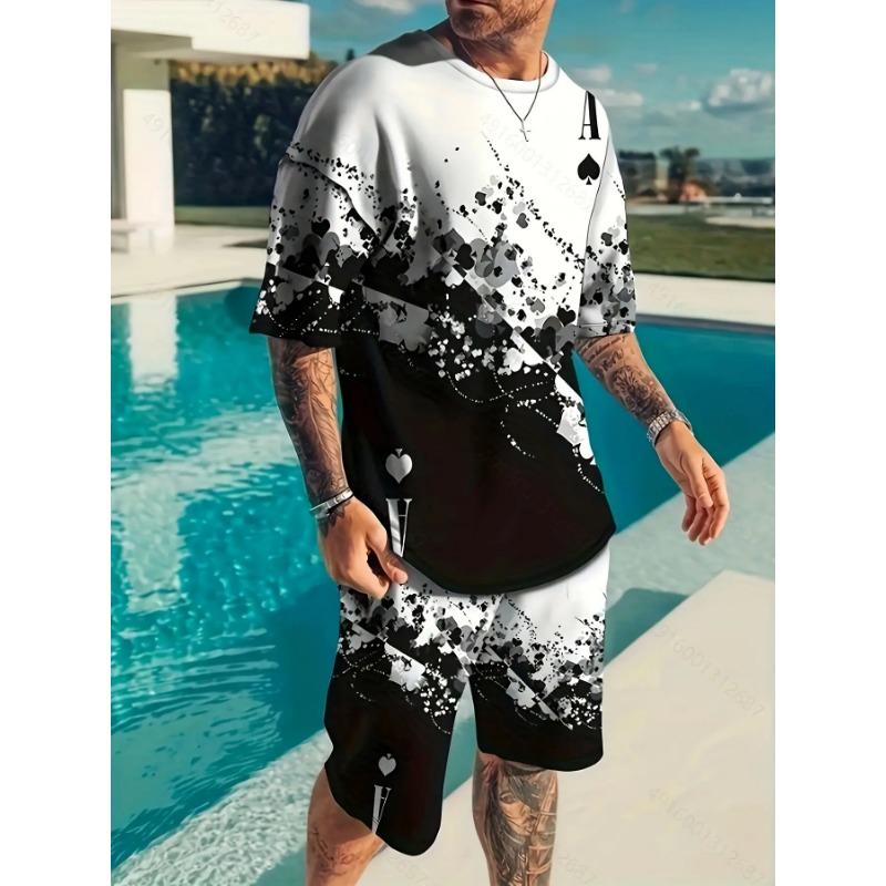 Men's plus size vintage black and white striped athleisure T-shirt shorts set made of polyester