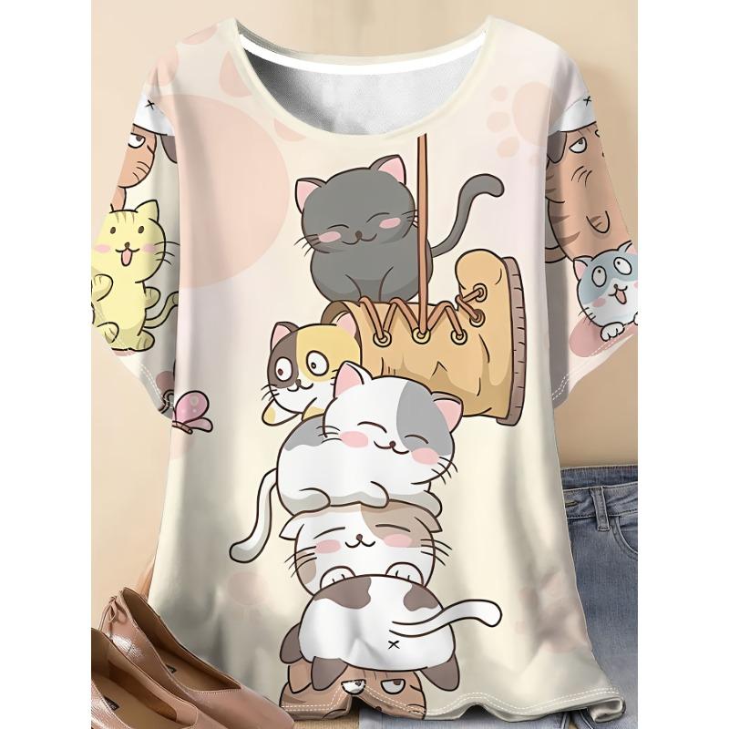 Large size women's 3D pattern group cute cat print T-shirt - casual short sleeved round neck top outfit