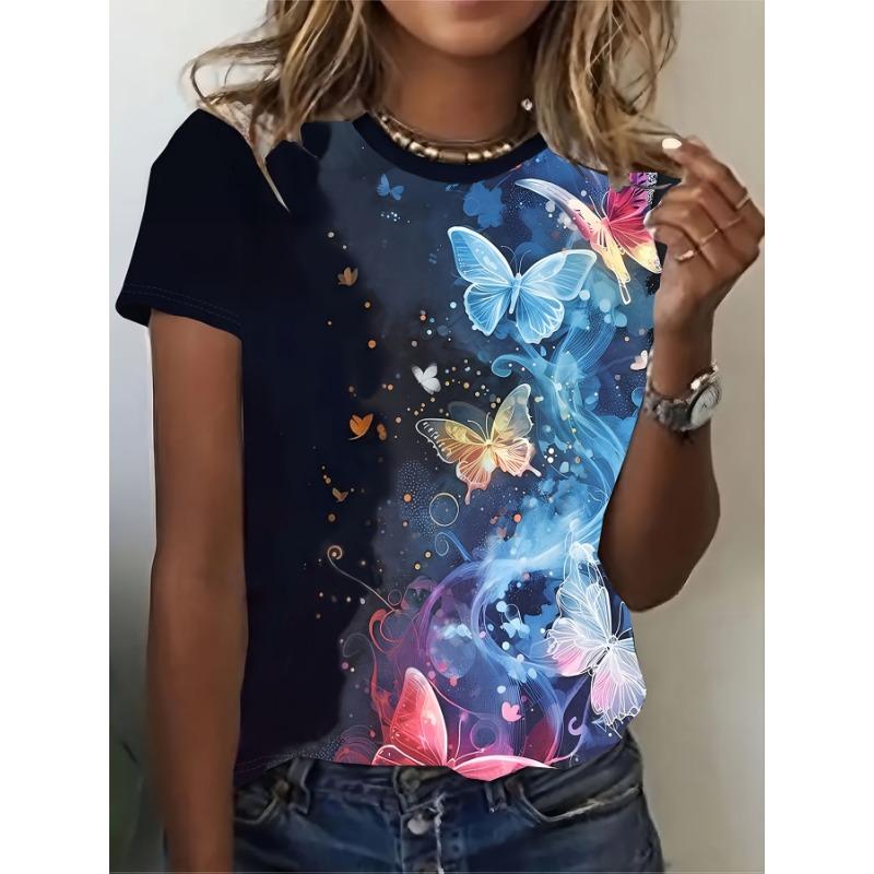 2025 Summer New Plus Size Short Sleeved Butterfly Round Neck T-shirt Printed Women Casual T-shirt Quick Drying and Breathable