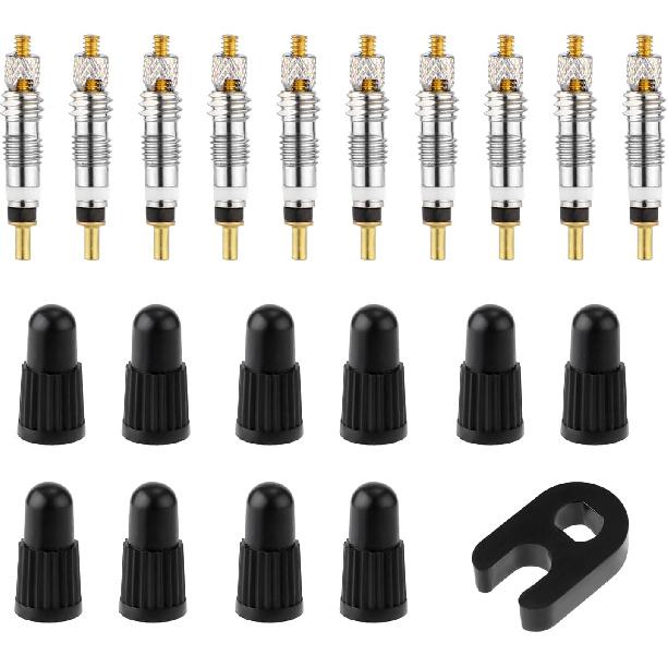 Valve Core Repair Kit for Presta, Including 10pcs Valve Cores, 10pcs Tyre Valve Core Stem Caps and Valve Core Remover Removal Tool Tubeless Valve