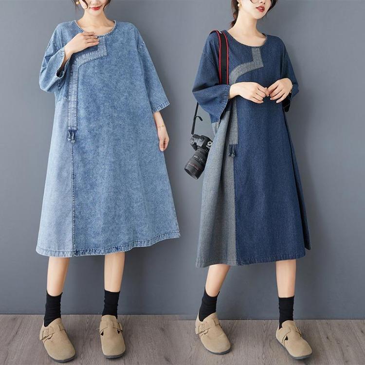 New Vintage Summer Denim Dress Women Plus Size Elegant Loose Blue Maxi Basic Dresses O Neck