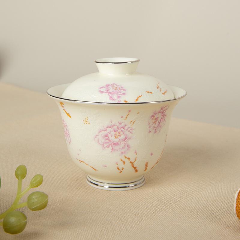 Apricot Yellow Butterfly & Floral Gaiwan Tea Cup with Silver Edge - High-grade Ceramic for Women's Tea Brewing