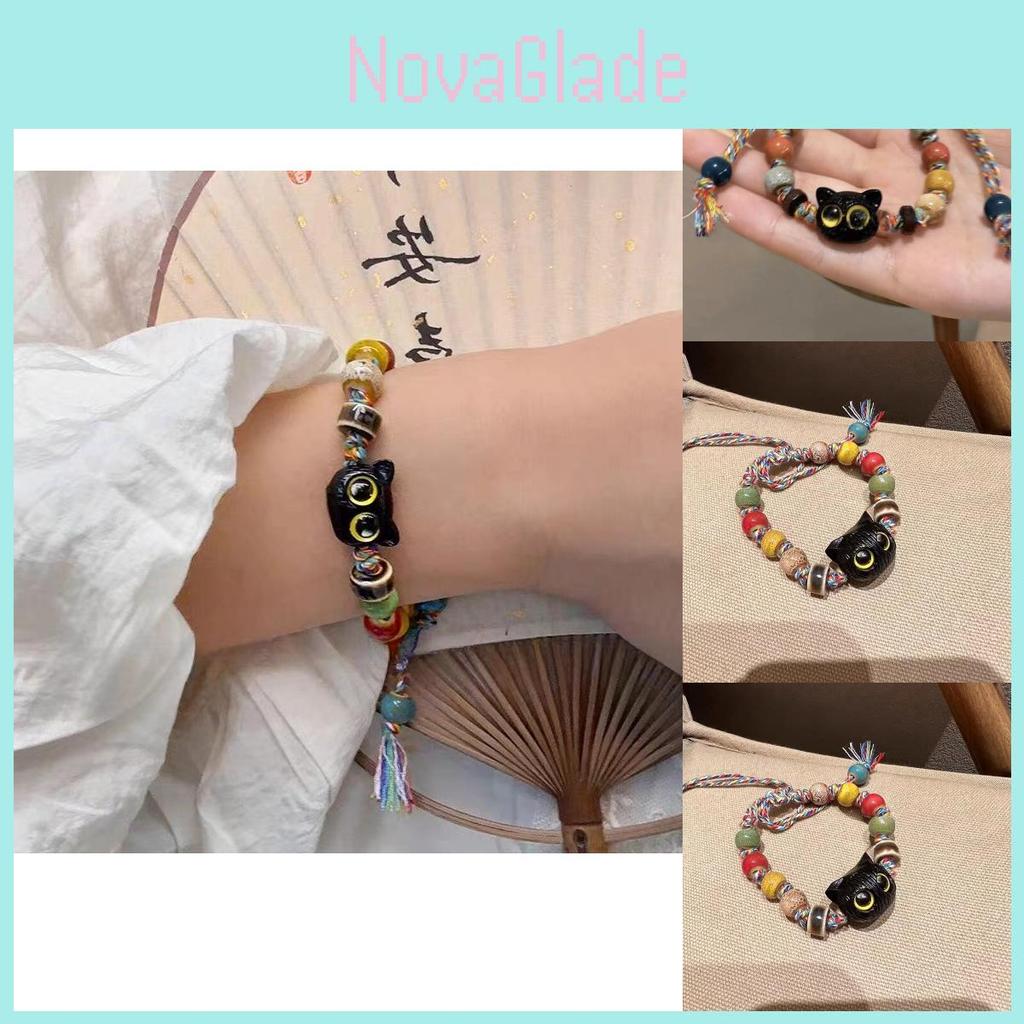 Exquisite Black Cat Ceramic Beaded Bracelet Colorful Cord New Chinese Style Jewelry