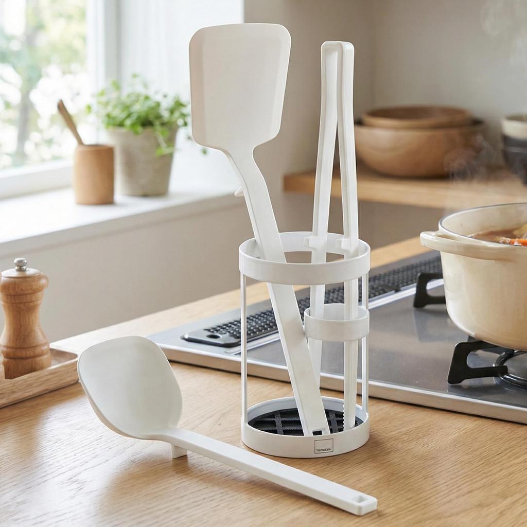 Yamazaki Silicone Tools Set Tool White tower 5189 5191 5195 6773 (Ladle, Spatula, Chopsticks/Tongs + Stand) [4-Piece Set]