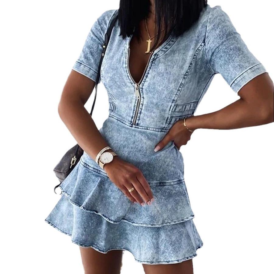 Rochie de vară mini casual din denim, cu mânecă scurtă și decolteu în V ()