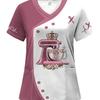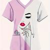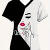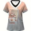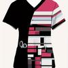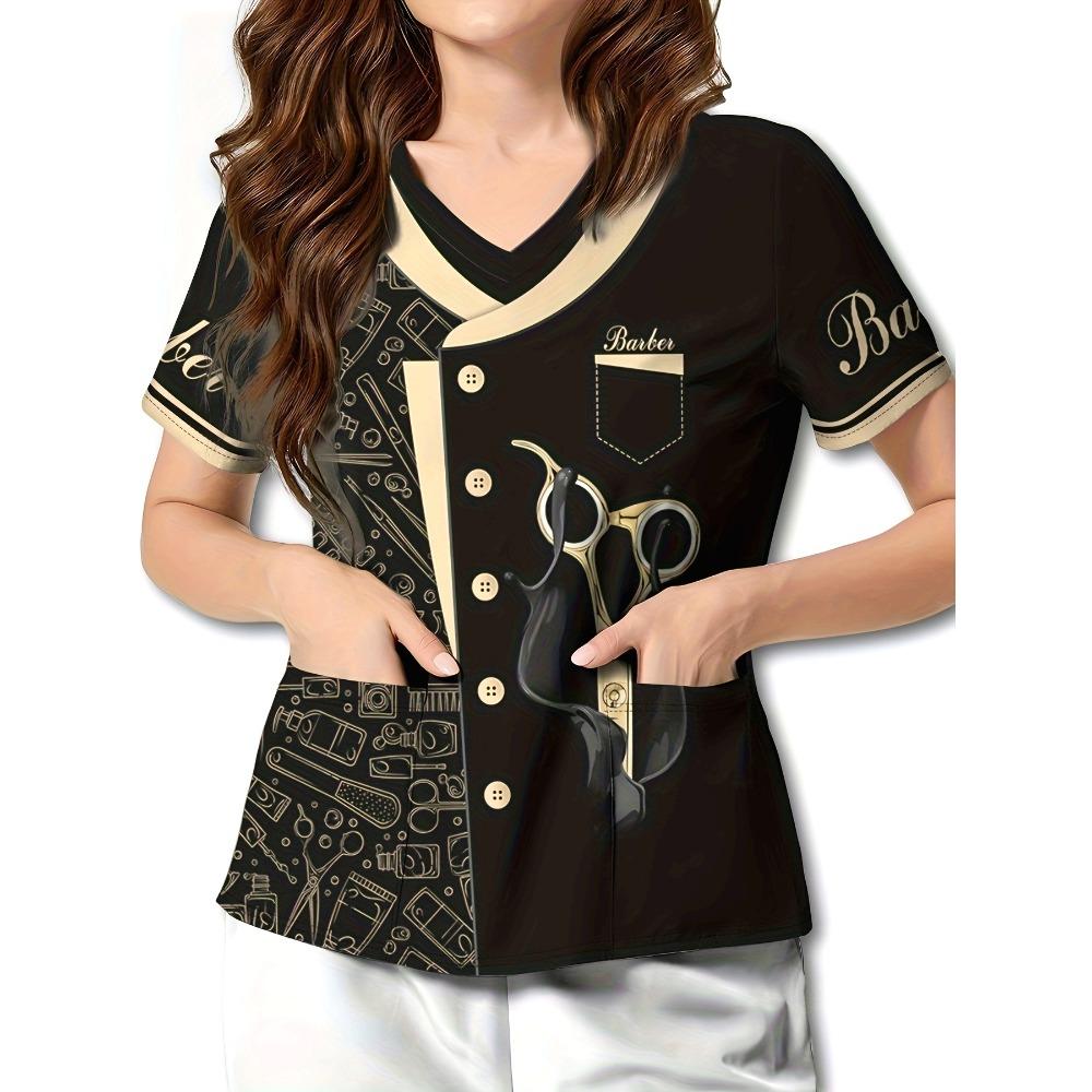 2025 Women's Summer Clothes Stylish Barber Uniform - Black V-Neck T-Shirt with Scissors Comb Print Perfect for Hairdressers