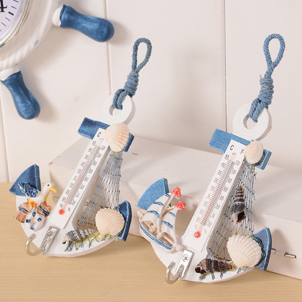 2Pcs Beach Style Hanging Ornaments Anchor Wall Hooks Mini Thermometer Shells Net Nautical Decor Bedroom Photography Background
