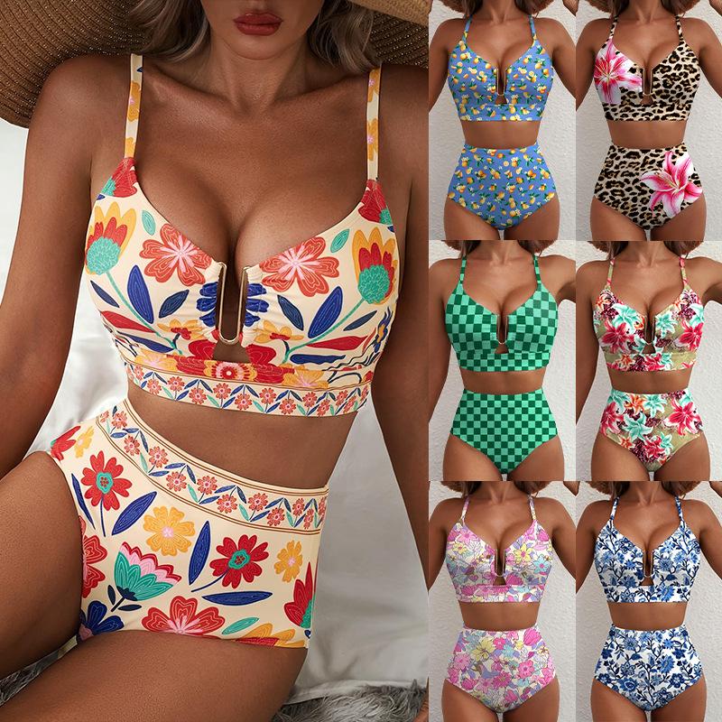 Women's High Waist U-Line Bikini Set Floral Print Swimsuit Cross Back Swimming