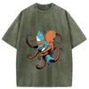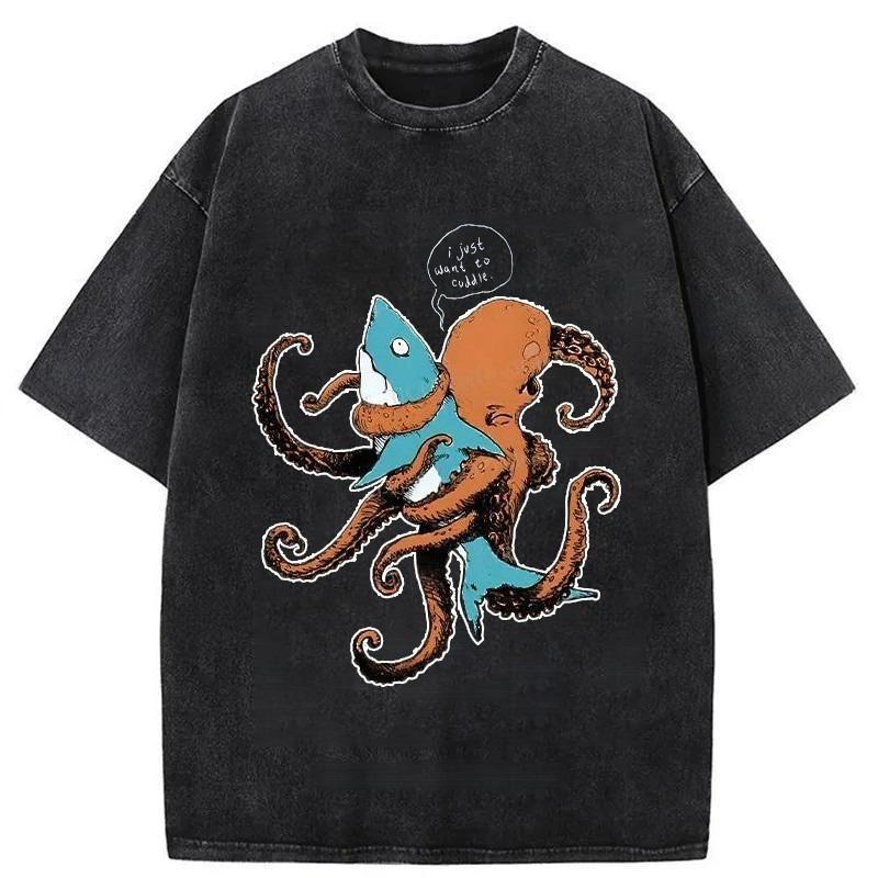 Japanese Style Y2K Hip hop Men's T-shirts Octopus Entangles Shark Washed T-Shirt Summer Retro Vintage Short Sleeve
